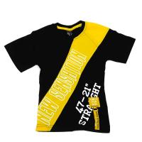 Футболка "два-колор"для мальчика, из х/б трикотажа, прямого силуэта, с фигурным рельефом, украшенным крупной надписью. Горловина круглая обработана воротником из рибаны. Горловина спинки внутри укреплена настрочной планкой из кулирки контрастного цвета. Рукав реглан. Низ изделия и рукавов обработаны швом вподгибку двойной строчкой.Размер 110: длина- 46 см, обхват груди- 52 см.