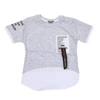 Футболка для мальчика, из эластичного, х/б трикотажа, со стильным принтом-нашивкой из трикотажа с надписями, украшенным вышивкой и смесовой лентой. Горловина на трикотажном манжете. Рукав с двойным подворотом разных цветов. Надпись на одном рукаве. Фигурный рельеф на полочке. Полукруглый низ.Размер 92: длина- 37 см, обхват груди- 54 см.
