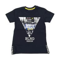 Футболка для мальчика, из х/б трикотажа, со стильным принтом, украшенным декоративной тесьмой с надписями и клепкой. Горловина на манжете, с внутренней отделкой трикотажным кантом со стороны спинки. По боковым швам небольшие разрезы, отделанные декоративной тесьмой с клепками.Размер 110: длина- 48 см, обхват груди- 68 см.