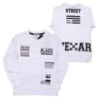 Джемпер на манжете. Горловина, рукав на манжете. На полочке и спинке надписи рисунки.Размер 110: длина- 43 см, обхват груди- 59 см, длина рукава- 40 см.
