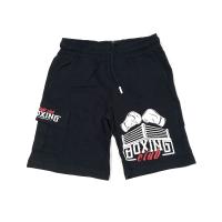 Шорты для мальчика из х/бтрикотажа. В поясе на закрытой резинке, со шнурком с наконечниками. Два боковых прорезных кармана. Один накладной карман с клапаном и нашивкой с надписью. Принт "клуб бокса" на одной штанине.Размер 128: длина 39 см, обхват талии 60-66 см.