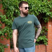 Футболка мужская прямого силуэта, с втачным коротким рукавом. Передняя половинка декорирована надписью на английском языке "Hustle". Вырез горловины круглый, форма выреза связана трикотажной эластичной резинкой. Горловина спинки внутри обработана настрочной планкой из кулирки. Низ изделия и рукавов подвернут и прострочен двойной строчкой.Размер 48: длина- 74 см, обхват груди- 106 см.