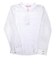 Блузка прямого силуэта из эластичного х/б трикотажа (кулирное полотно). По полочке вырез в виде капельки на пуговке, кокетка из эластичного гипюра. Блузка красиво драпируется с рукавами из легкой прозрачной струящейся ткани. Рукав длинный втачной. Низ рукавов на манжете с застежкой на 2 пуговицы. Пуговицы золотисто-перламутровые с рисунком "бантик". Низ изделия обработан швом вподгибку двойной строчкой.Размер 158: длина- 54 см, обхват груди- 72 см, длина рукава- 55 см.
