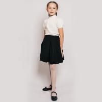 Водолазка для девочки, с втачным коротким рукавом. Выполнена из однотонного дышащего фактурного хлопка – кулирное полотно. Модель прямого покроя. На полочке сборка по горловине. Вырез горловины круглый, обработан воротником-стойкой, из основной ткани. Рукав по типу "фонарик" со сборкой по окату и низу рукава. По низу рукава манжета из основного полотна. Низ изделия подвернут и прострочен двойной строчкой.Размер 128: длина- 46 см, обхват груди- 70 см.
