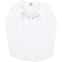 Джемпер для девочки, из х/б трикотажа. Полуприлегающий силуэт. Горловина отделана трикотажным кантом и украшена гипюром, стразами и бусинами.Размер 116: длина- 51 см, обхват груди- 61 см, длина рукава- 46 см.