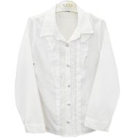 Блузка для девочки из тонкой, полупрозрачной ткани. Полуприлегающий силуэт. Отложной воротник на стойке. Планка с вертикальными рельефами, рюшами и застежкой на пуговицы, украшена кружевом. Рукав на манжете с застежкой на пуговицу. На рукаве дополнительная пуговица и шлевка, для заворачивания рукава.Размер 134: длина- 51 см, обхват груди- 72 см, длина рукава- 47 см.
