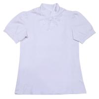 Джемпер для девочки из эластичного х/б трикотажа. Полуприлегающий силуэт. Воротник-стойка украшен вшитым бантом из эластичного кружева. Рукав-фонарик присобран на манжету.Размер 122: длина- 42 см, обхват груди- 58 см.