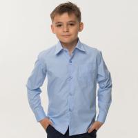 Рубашка для мальчика голубого цвета. Прямой силуэт, c длинным рукавом из сорочечной ткани. Классический, небольшой воротник на стойке. Застежка на пуговицы. Один накладной карман на груди. Рукав на манжете с застежкой на пуговицу. Спинка на кокетке. Полукруглый низ.Размер 52 (122-128): длина 50 см, обхват груди 70 см, длина рукава 43 см.