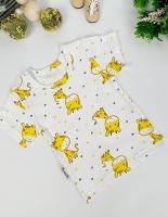 Футболка детская, выполнена из мягкого и легкого 100%-го хлопка - интерлок. Модель прямого силуэта, швами вовнутрь, с втачным коротким рукавом. Ткань декорирована принтом "Жирафики". Линия горловины круглая, обработана бейкой из основного полотна. На плечике застежка на 2 пробивные кнопки. Низ изделия и рукавов обработан швом вподгибку двойной строчкой. В боковом шве вшивной элемент.Размер 68: длина- 32 см, обхват груди- 46 см.