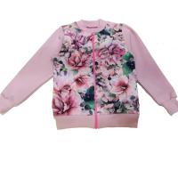 Бомбер для девочки, из эластичного, х/б футера, с красочным цветочным принтом на полочке. Горловина, рукав, низ бомбера на трикотажных манжетах. Застежка молния по центру, по всей длине.Размер 98: длина- 38 см, обхват груди- 59 см, длина рукава- 33 см.