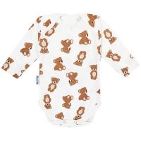 Боди с длинным втачным рукавом, выполнено из хлопкового трикотажа - интерлок. Изделие украшено нежным принтом "Мишки". Вырез горловины круглый, обработан трикотажным кантом из основного полотна. Модель на плечиках с запахом. Кнопки-застежки в паховой зоне снизу, между пройм. Внутренние швы.Размер 62: длина - 36 см, обхват груди - 44 см, длина рукава - 20 см.