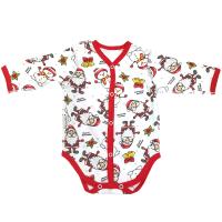 Боди из х/б трикотажа (интерлок). Ткань с праздничным принтом "Дедушка Мороз с маленьким помощником". Горловина, планка с застежкой, проймы отделаны трикотажным кантом контрастного цвета. Рукав длинный втачной. Застежка кнопки по центру, по всей длине и снизу, между пройм. В размере 56 рукав с варежкой антицарапкой. Наружные швы у размеров 56, 62,68.Размер 56 Длина - 34 см, обхват груди - 43 см, длина рукава от горловины (с учетом рукавички) - 24 см (без рукавички - 19,5 см).