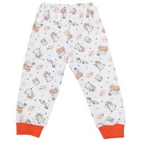 Утепленные брючки свободного кроя для малыша. Изготовлены из трикотажного полотна - футер, с мягкой изнанкой с начесом, с нанесением рисунка "Забавные животные". Модель швами вовнутрь, на закрытой резинке в поясе. Снизу на трикотажных эластичных манжетах из рибаны оранжевого цвета.Размер 74: длина - 44 см, обхват талии - 38-54 см.