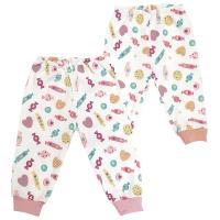 Брючки свободного кроя для новорожденных малышек. Изготовлены из мягкой и дышащей ткани - интерлок, с нанесением рисунка "Конфетки" (100% хлопок). Модель швами вовнутрь, на закрытой резинке в поясе. Снизу на трикотажных эластичных манжетах в нежно-розовом оттенке.Размер 62: длина- 38 см, обхват талии- 36-46 см.