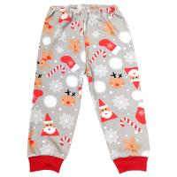 Брючки свободного кроя для новорожденных малышей. Выполнены из мягкой и дышащей ткани – интерлок, с нанесением праздничного рисунка "Санта, олени, трость, имбирный пряник, носок, снежинки" (100% хлопок). Модель швами вовнутрь, в поясе на закрытой резинке. Низ брючин заканчивается манжетом в рубиново-красном оттенке.Размер 68: длина- 40 см, обхват талии- 36-56 см.