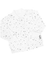 Кофточка свободного кроя из кулирного полотна. Украшена нежным принтом "Звездочки". Длинный втачной рукав. Горловина и рукав на трикотажных манжетах из рибаны в тон. Застежка кнопки по центру, по всей длине. Низ изделия обработан швом вподгибку двойной строчкой. Наружные швы.Размер 56: длина - 26 см, обхват груди - 44 см, длина рукава - 16 см.