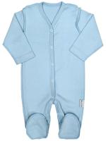 Комбинезон однотонный свободного кроя для новорожденных малышей. Выполнен из мягкого трикотажного полотна (интерлок). Модель с закрытыми носочками. Горловина, планка обработаны трикотажным кантом из основного полотна. Длинный втачной рукав, низ рукавов подвернут и прострочен двойной строчкой. Застёжка комбинезона выполнена в виде удобных кнопок по центру, по всей длине туловища, и по штанишкам. Штанишки с ластовицей. С лицевой стороны в боковом шве вшивной элемент. У размеров 50 и 56 низ рукавов закрыт варежками - антицарапками. У размера 56 рукав-реглан.Размер 50: длина - 43 см, обхват груди - 37 см, длина рукава (с учетом рукавички) - 20 см (без рукавички 16 см).