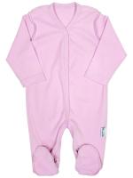 Комбинезон однотонный свободного кроя для новорожденных малышей. Выполнен из мягкого трикотажного полотна (интерлок). Модель с закрытыми носочками. Горловина, планка обработаны трикотажным кантом из основного полотна. Длинный втачной рукав, низ рукавов подвернут и прострочен двойной строчкой. Застёжка комбинезона выполнена в виде удобных кнопок по центру, по всей длине туловища, и по штанишкам. Штанишки с ластовицей. С лицевой стороны в боковом шве вшивной элемент. У размеров 50 и 56 низ рукавов закрыт варежками - антицарапками. У размера 56 рукав-реглан.Размер 50: длина - 43 см, обхват груди - 37 см, длина рукава (с учетом рукавички) - 20 см (без рукавички 16 см).
