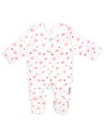 Комбинезон свободного кроя для новорожденных малышей. Декорирован принтом "Цветы". Модель с закрытыми носочками. Выполнен из мягкого трикотажного полотна (интерлок). Горловина, планка обработаны трикотажным кантом из основного полотна. Длинный втачной рукав, низ рукавов подвернут и прострочен двойной строчкой. Застёжка комбинезона выполнена в виде удобных кнопок по центру, по всей длине туловища, и по штанишкам. Штанишки с ластовицей. С лицевой стороны в боковом шве вшивной элемент. У размера 56 рукав-реглан и низ рукавов закрыт варежками - антицарапками.Размер 56: длина - 46 см, обхват груди - 48 см, длина рукава от горловины (с учетом рукавички) - 28 см (без рукавички 23 см).