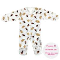 Комбинезон свободного кроя для новорожденных мальчиков. Модель с закрытыми носочками, швами наружу. Выполнен из мягкого и легкого трикотажного полотна – интерлок, с нанесением рисунка "Кедровые орешки и листочки" (100% хлопок). Горловина отделана трикотажным кантом. Застёжка комбинезона выполнена в виде удобных кнопок по центру, по всей длине туловища, и по штанишкам. Штанишки с ластовицей.Длинный рукав-реглан - размеры 56,62.
