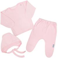 Комплект для новорожденных, состоящий из распашонки, ползунков и чепчика. Выполнен из х/б трикотажа (интерлок). Распашонка с запахом. Рукав с варежкой антицарапкой. Застежка кнопки снаружи с левой стороны, изнутри с правой стороны. Наружные швы.Ползунки прямого кроя. В поясе на закрытой резинке. Наружные швы.