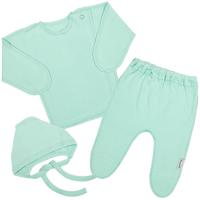 Комплект для новорожденных, состоящий из распашонки, ползунков и чепчика. Выполнен из х/б трикотажа (интерлок). Распашонка с запахом. Рукав с варежкой антицарапкой. Застежка кнопки снаружи с левой стороны, изнутри с правой стороны. Наружные швы.Ползунки прямого кроя. В поясе на закрытой резинке. Наружные швы.