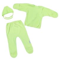 Комплект для новорожденных, состоящий из распашонки, ползунков и чепчика. Выполнен из однотонного х/б трикотажа (интерлок).Распашонка с запахом. Рукав с варежкой антицарапкой. Застежка кнопки снаружи с левой стороны, изнутри с правой стороны. Наружные швы.