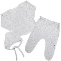 Комплект для новорожденных, состоящий из распашонки, ползунков и чепчика. Выполнен из х/б трикотажа (интерлок). Распашонка с запахом. Рукав с варежкой антицарапкой. Застежка кнопки снаружи с левой стороны, изнутри с правой стороны. Наружные швы.Ползунки прямого кроя. В поясе на закрытой резинке. Наружные швы.