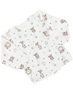 Распашонка с запахом, свободного кроя. Выполнена из х/б трикотажа (интерлок) и украшена принтом "Плюшевые звери". Рукав с варежкой-антицарапкой. Застежка кнопки снаружи с левой стороны, изнутри с правой стороны. Наружные швы.Размер 50: длина - 23 см, обхват груди - 38 см, длина рукава по внутреннему шву (от горловины с учетом рукавички) - 21 см.