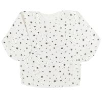 Утепленная распашонка для новорожденных. С запахом, свободного кроя. Выполнена из хлопкового трикотажа - футер с мягким начесом. Модель декорирована принтом "Звездочки". Рукав с варежкой антицарапкой. Застежка кнопки снаружи с левой стороны, изнутри с правой стороны. Наружные швы.Размер 50: длина - 23 см, обхват груди - 38 см, длина рукава по внутреннему шву (от горловины с учетом рукавички) - 21 см.