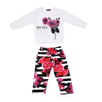 Костюм для девочки из х/б трикотажа.Джемпер с принтом "розы", украшенным стразами и бантиком из трикотажа с рисунком. Горловина, рукав отделаны трикотажным кантом. Низ джемпера на манжете. Застежка кнопки на правом плече.