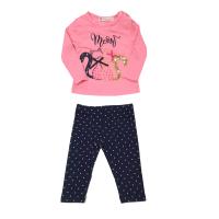 Костюм для девочки, из эластичного х/б трикотажа.Футболка с красочным принтом-вышивкой "кошечки" , украшенным пайетками и атласными бантиками. Полуприлегающий силуэт. Горловина отделана трикотажным кантом. Застежка кнопки на левом плече.