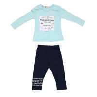 Костюм для девочки из эластичного х/б трикотажа.Джемпер с красочным притом, украшенным стразами и заворачивающими, из трикотажа полосками с надписями. Полуприлегающий силуэт. Горловина отделана трикотажным кантом. Застежка кнопки на правом плече.
