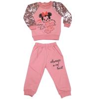 Костюм для девочки, из эластичного х/б футера.Джемпер с принтом "минни маус", украшенным стразами. Рукав-реглан отделан сеткой с пайетками. Горловина, рукав, низ джемпера на трикотажных манжетах. Застежка две кнопки на спинке.