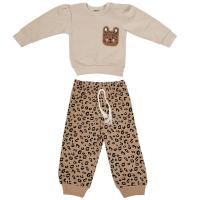 Утепленный костюм 2-ка для девочки, состоящий из джемпера и брюк.Джемпер прямого кроя. На полочке украшены махровой аппликацией "Леопард". Круглый вырез горловины, на левом плече застегивается на кнопки. Длинный рукав втачной. Горловина, низ изделия и рукавов выполнены из кашкорсе.