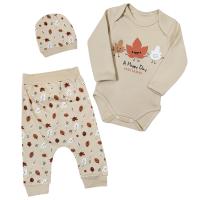 Комплект из 3 предметов: боди, штанишки, шапочка. Выполнен из трикотажного полотна (интерлок).Боди с красочным принтом на полочке. На плечиках с запахом. Застежка кнопки снизу, между пройм. Горловина, рукав, проймы отделаны трикотажным кантом из основного полотна.