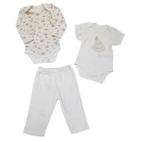 Комплект из 3 предметов: 2 боди одного размера и штанишки из х/б трикотажа.Боди с красочным принтом "царевна лебедь" с коротким рукавом. Другой боди с нежным цветочным принтом с длинным рукавом. На плечиках с запахом. Застежка кнопки снизу, между пройм. Горловина и проймы отделаны трикотажным кантом.