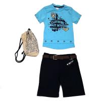 Костюм для мальчика, из х/б трикотажа.Футболка из х/б трикотажа кулирное полотно, с надписями и нашивками, вышитыми блестящей нитью. Горловина на трикотажном манжете. Рукав с отворотом, украшенным металлическими клепками. Низ отделан релефом с металлическими кольцами.