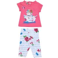 Костюм для девочки из эластичного х/б трикотажа (кулирное полотно). Футболка с красочным термотрансфером "Путешествие на кораблике-оригами". Полуприлегающийй силуэт. Горловина отделана трикотажным кантом. Футболка декорирована розочками из атласной ленты. Низ изделия и рукавов обработан швом вподгибку двойной строчкой.Лосины на закрытой резинке в поясе. Ткань с надписями и цветами. Низ изделия обработан швом вподгибку двойной строчкой.
