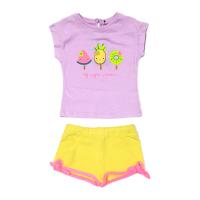 Костюм для девочки.Футболка полуприлегающего кроя, с заниженной проймой. На груди яркий принт "сладости" с объемной фигуркой из ткани. Горловина на манжете. Застежка пуговица на спинке.