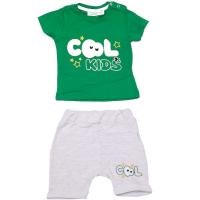 Костюм для мальчика. Футболка из х/б трикотажа. Горловина на манжете. Застежка кнопки на левом плече. На груди надпись с аппликацией из трикотажа и вышивкой.