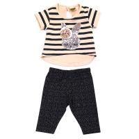 Костюм для девочки, из х/б трикотажа.Футболка с короткими рукавами, с принтом"зайчик", украшенным пайетками и розочкой из лент. Спинка удлиненная. Горловина обработана трикотажным кантом. Застежка на спинке "капля".