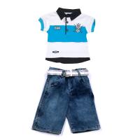 Костюм для мальчика: футболка-поло, шорты.Футболка-поло из х/б трикотажа интерлок, с вышивками-эмблемами на груди. Отложной воротник на стойке, из х/б ткани. Застежка пуговицы. Рукав на трикотажном манжете. Низ отделан полукруглой вставкой из х/б ткани.