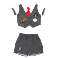 Комплект для мальчиков: футболка, шорты, галстук.Футболка с отложным воротником, застежка на кнопки. Короткие рукава с отворотом из отделочной ткани. Полочка с имитацией жилета. "Жилет" с воротником-шаль, застежка функциональная на две кнопки, украшен вышивкой-эмблемой. Галстук съемный на резинке.