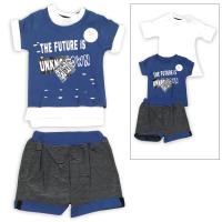 Комплект одежды для мальчиков: двойная футболка и шорты.В комплекте две футболки, которые одеваются одна на другую или можно носить по раздельности. Нижняя футболка длиннее верхней, низ с открытым срезом (не обработан), рукава удлинены с учетом подгиба. Горловина на трикотажной манжете. застежка на кнопки на левом плече. Верхняя футболка украшена надписями и ярким термопринтом. полочка с декоративными сквозными прорезями.