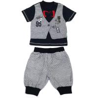Оригинальный комплект для мальчиков. Футболка прямого кроя с имитацией жилета из плотного трикотажа. Полочка "жилета" украшена фирменной нашивкой и термопечатью, К полочки "жилета" скреплены пеговицей. Футболка однотонная украшена имитацией галстука-бабочки. Застежка на левом плечике (кнопки).Шорты из тонкого тканого материала с боковыми карманами и имитацией гульфика. Пояс и низ на трикотажной манжете. Пояс на внутренней резинке. Заднее полотнище на кокетке.