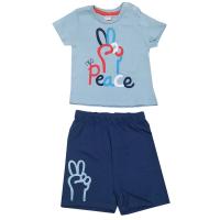 Комплект для мальчиков из100% хлопка. Футболка прямого кроя, застежка на левом плечике (кнопки). Полочка украшена термопринтом мир.Шорты однотонные на эластичной резинке, украшенные термопринтом мир.