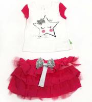 Нарядный костюм для маленькой принцесы. Футболка полуприталенный солуэт. На спинке вырез- капелька и застёжка на пуговку. Пышная юбочка, Скроена из воланов в три ряда. В поясе эластичная резинка.Рост 74 см, длина футболки- 31 см, обхват груди- 48 см, длина юбки- 16 см, обхват талии- 46 см.