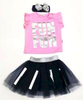 Нарядный костюм для девочки.Топ с крупной, блесящей надписью на груди. Прямой крой. Горловина на манжете. Рукав- крылышко. Застежка кнопка на одном плече.