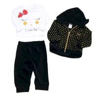 Костюм тройка из трикотажа, для девочки.Мастерка с капюшоном, из вельвета в золотистый горошек (80% хлопок, 20% вискоза). Рукав, низ мастерки на манжетах. Застежка молния по центру, по всей длине. Украшена металлической, фирменной наклейкой.
